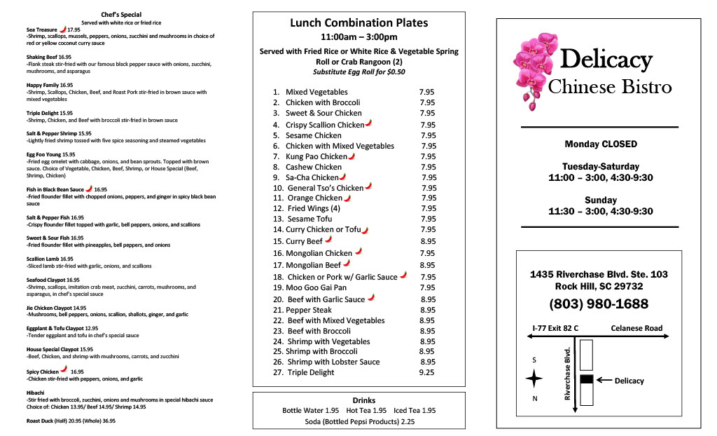 Welcome to Delicacy Chinese Bistro, a culinary gem located in Rock Hill, SC, that brings authentic Chinese flavors to your table. Their menu is a delightful mix of classic dishes and innovative appetizers that awaken the palate. Begin your meal with crispy spring rolls or the crowd-pleasing crab rangoons, praised for their delightful crunch and rich fillings.